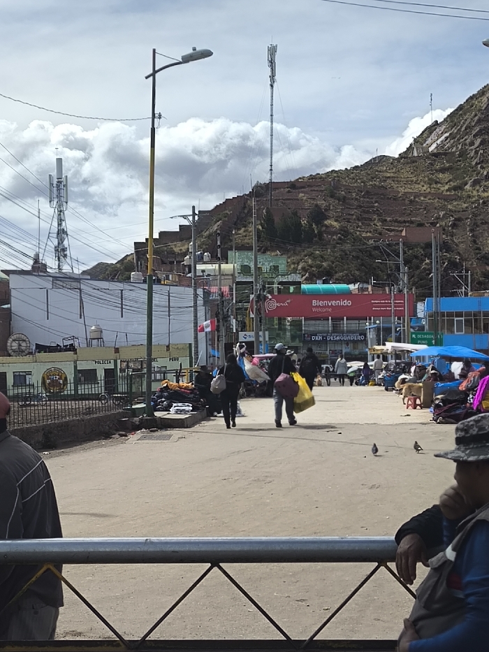 bustling border town scene with a dirt road leading into a market area. People are carrying bags and setting up stalls. A "Bienvenido" sign hangs above the road. In the background, a steep hill rises with some visible terracing. Utility poles and cell towers are scattered throughout the landscape. A police station is visible on the left side of the road. Two birds stand in the middle of the road in the foreground. A person leans against a railing in the lower foreground of the picture.