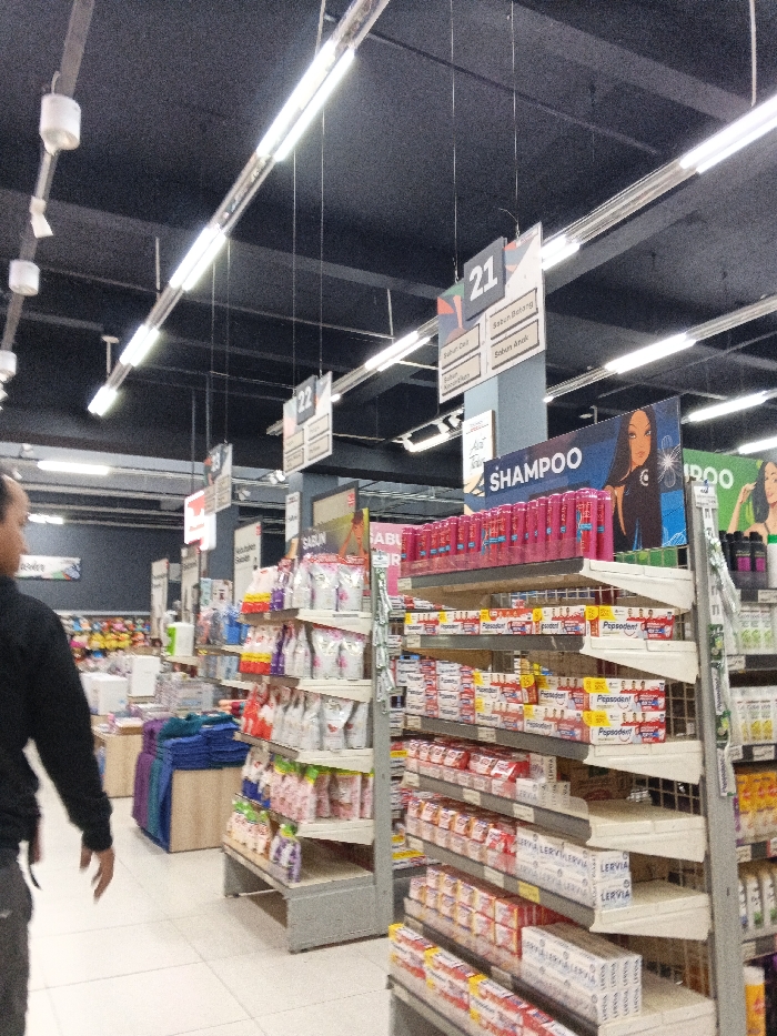 The image captures a supermarket aisle with shelves stocked with products. Signage indicates sections for "SHAMPOO," "SABUN" (soap), and numbered aisle markers "21" and "22". Various brands of shampoo, toothpaste (Pepsodent), and soap (LERVIA) are visible. A person's torso is seen on the left side of the image. The aisle is brightly lit with overhead fluorescent lights.