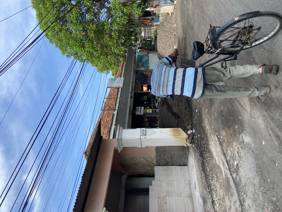A male individual is observed from behind, walking in a forward direction on a paved street in Balonggabus, Indonesia, pushing a dark-colored bicycle equipped with a front basket and a rear rack holding a dark bag. The man wears a blue and white striped short-sleeved shirt, light khaki-colored long pants, and dark sandals. The street surface is dark and uneven, with scattered dirt and debris. On the left side of the scene, a light peach-colored building with a brown corrugated roof features a closed grey metal shutter. The lower facade of this building is constructed from light-colored rectangular blocks. Adjacent to it, separated by a white concrete pillar with partial, indistinct text, is a retail establishment. This shop displays a sign reading "JAYA MAKMUR" and other partially visible advertisements. A substantial pile of dark soil or earth is present directly in front of this shop, extending onto the road. Further to the right, a large pile of light-colored gravel is visible next to a large, dense green tree. Overhead, numerous black utility lines crisscross against a clear blue sky with minimal white cloud cover.