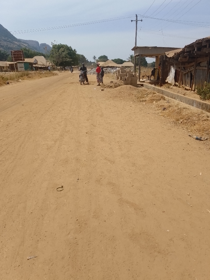 The image portrays a bright, sunlit roadside scene in Kpak, Nigeria. A wide, unpaved dirt road occupies the lower two-thirds of the frame, extending into the distance with visible tire tracks and sparse debris, including a small metallic ring-like object in the foreground. In the mid-ground, three individuals are positioned to the left of the road's center. A dark-skinned male stands next to a dark motorcycle. Beside him are two dark-skinned females, one in a red top and patterned skirt, the other in a patterned dress, with one appearing to carry an item on her head. To their immediate right, a stack of concrete blocks is arranged on the roadside, adjacent to a low mound of reddish-brown earth. A concrete drainage channel runs parallel to the road on the right, bordering a series of structures. These structures include a dilapidated building with a corrugated metal roof and a wooden framework, and an open-sided shelter where a dark-skinned male is seated on a bench. A utility pole with overhead power lines stands near the right edge. In the background, further along the road, more single-story structures and scattered trees are visible. A prominent range of mountains dominates the far background under a clear, pale blue sky. The environment appears dry with minimal vegetation.
