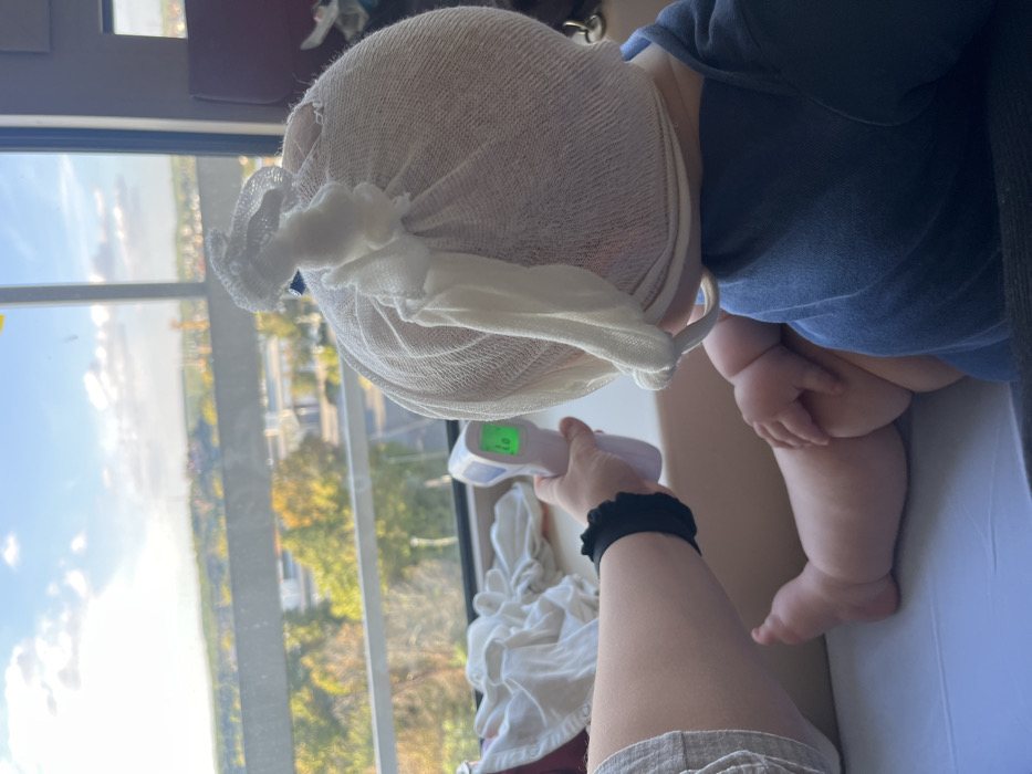 The image depicts an indoor scene with an elevated panoramic view of Bad Kreuznach, Germany, visible through a large window. In the foreground, an adult's fair-skinned forearm, adorned with a black ruffled wristband, is visible on the left. The adult's hand holds a white, handheld infrared thermometer, displaying a green illuminated digital readout, pointed towards the head of an infant. The infant is seated with its back to the viewer, facing the window. It wears a blue garment and has a white, gauze-like fabric cap, loosely tied at the crown, covering its head. The infant's bare right arm and left leg are visible. The infant is positioned on a light blue padded surface, consistent with a medical examination table or bed. To the left of the infant, on a light beige surface, are folded white linens. The background vista, viewed from an upper floor, shows an urban landscape under a partly cloudy sky, featuring buildings, roads, and numerous trees displaying green and autumnal foliage. Horizontal window frames cross the distant view.