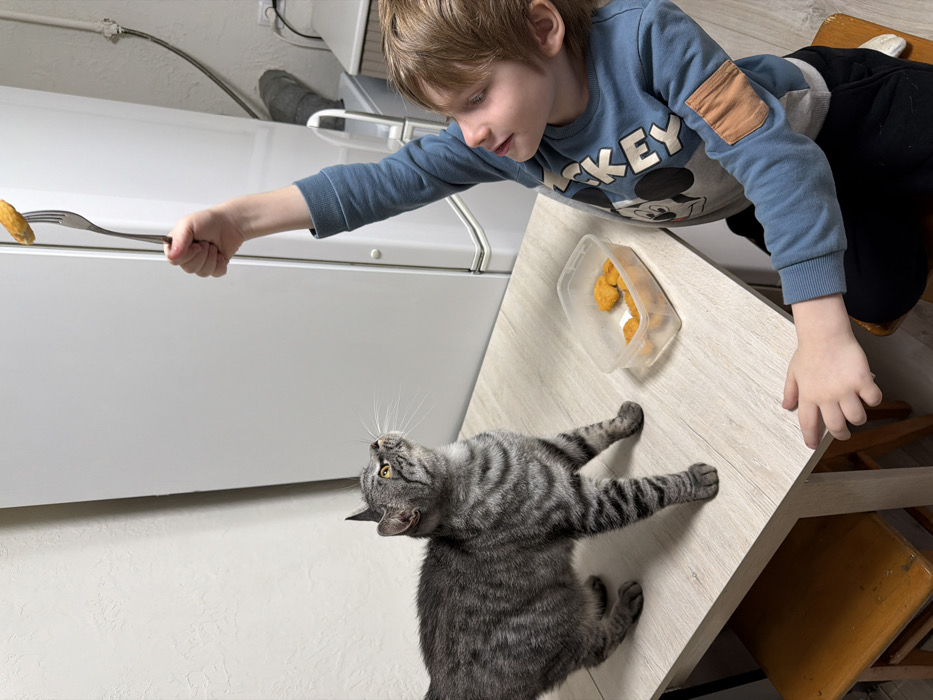 An indoor scene, presumably a domestic kitchen or dining area, is depicted from a slightly elevated perspective. A light-skinned child, approximately 4-6 years old, with light brown hair and blue eyes, is seated on a wooden stool on the right side of a light wood-grain table. The child wears a blue long-sleeved shirt featuring a large black and white Mickey Mouse graphic and light brown elbow patches, along with dark pants. The child's right arm is raised, holding a silver-colored fork with a single golden-brown chicken nugget impaled on its tines. The child's gaze is directed towards the fork and the cat. Standing on the table to the left of the child is a grey tabby cat with distinct dark grey or black stripes and yellow eyes. The cat is looking intently upwards at the chicken nugget held by the child. On the table, to the left of the child's hand, rests a clear plastic rectangular container holding several more identical golden-brown chicken nuggets, placed on what appears to be a white paper napkin or liner. The background consists of a plain, light-colored wall. A white refrigerator is partially visible behind the child and the cat. A thin, grey pipe or conduit runs vertically on the wall to the right of the refrigerator, and an electrical outlet with a plugged-in cord is visible nearby. Another simple wooden stool is partially visible beneath the table on the left. This scene is located in the city of Yuzhny, Russia.