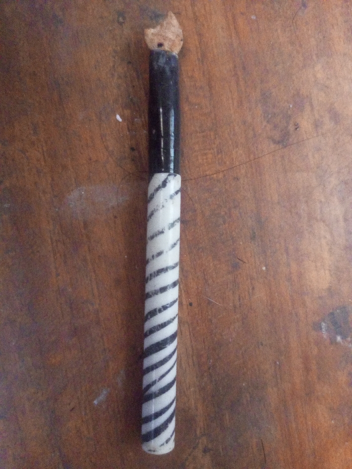 An elongated, cylindrical object is positioned vertically on a textured wooden surface in the city of Zee Pin Kone, Myanmar. The object's lower two-thirds display a white or off-white base with irregular, diagonally oriented black stripes. Above this patterned section, the object transitions to a solid black segment. The very top culminates in a small, light brown, irregularly shaped piece, resembling a stylized flame or a carved embellishment, with a small dark punctate mark at its center. The wooden background features a reddish-brown hue with visible grain patterns, minor surface abrasions, and scattered dust particles. Lighting is overhead and diffused, casting no discernible shadows. No individuals, actions, or interactions are visible.