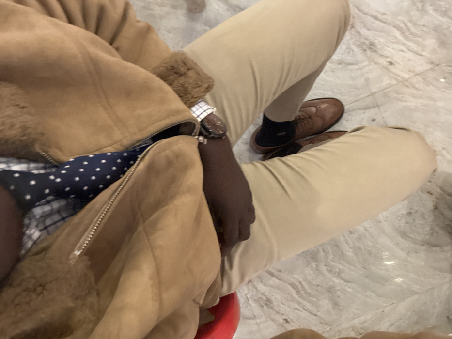 A high-angle, top-down view depicts a person from the upper torso to the feet, standing on a light-colored, veined marble or tiled floor in Jos, Nigeria. The dark-skinned individual wears a tan faux-shearling jacket, partially unzipped, over a blue and white plaid shirt and a navy blue tie with white polka dots. Tan trousers are paired with brown lace-up dress shoes and dark socks. A watch with a dark strap and metallic case is visible on the left wrist. One hand rests at the side, near the upper thigh. A partial red object is visible on the far left, and a blurred light-colored object appears in the background on the far right.