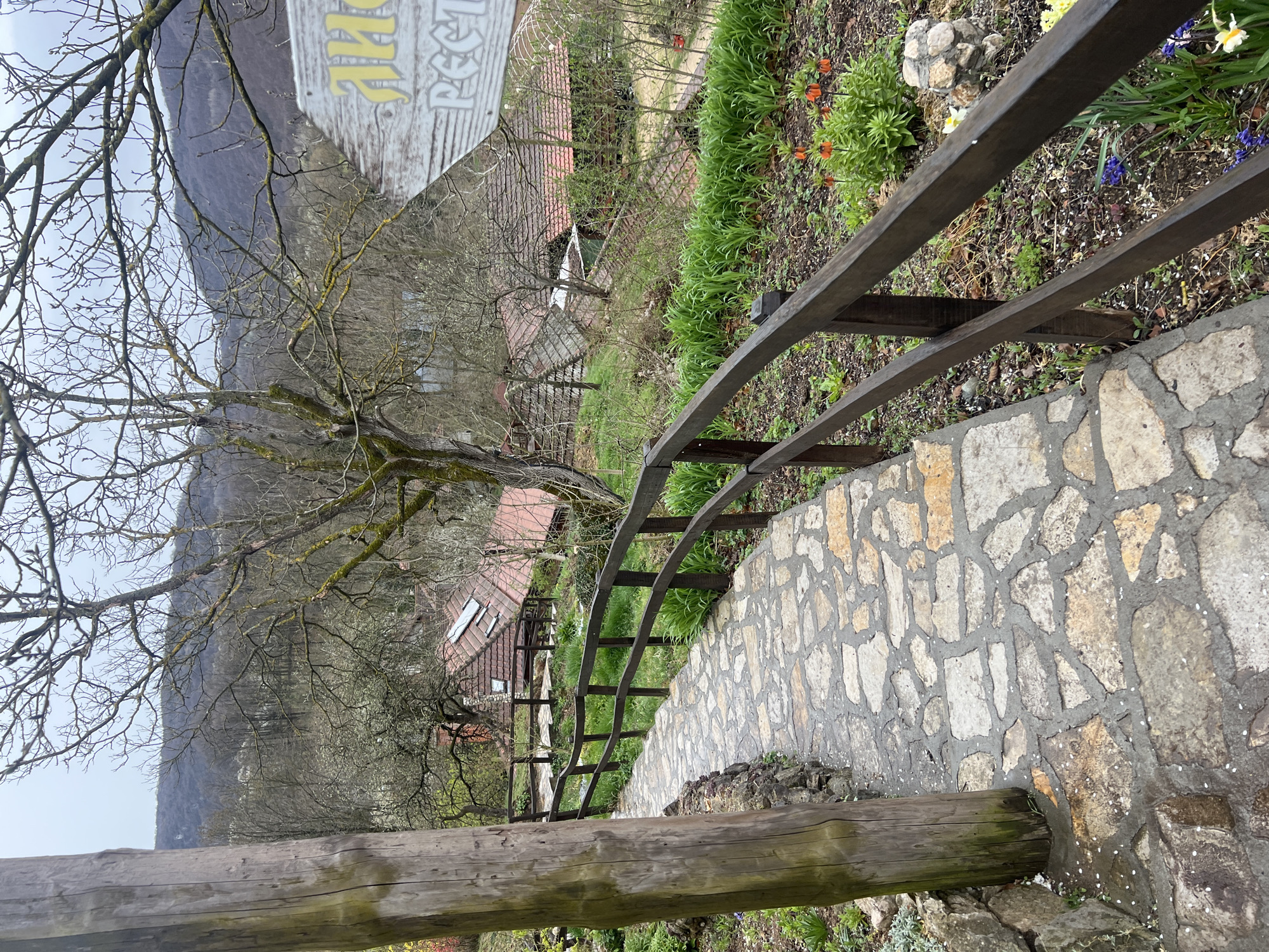 A downward-sloping, irregular flagstone path, flanked by dark brown wooden railings, descends through a terraced garden area. The path's immediate left edge features a thick, weathered wooden post with white petals scattered at its base. The garden on the right of the path contains emergent green foliage, orange fritillary flowers, blue grape hyacinths, and yellow daffodils or primroses, along with a small stone decorative element. Beyond the garden and railings, several buildings with traditional red-orange tiled roofs are visible further down the incline; at least two roofs feature skylight windows. The landscape is characterized by deciduous trees, many bare or lightly budding with moss and lichen, suggesting early spring. A weathered wooden sign with partially visible Cyrillic text in yellow ("ЛИC..." and "PECT...") is present on the right, partially obscured by tree branches. Distant hills, densely covered with trees, form the horizon under an overcast sky. The scene is located within the Despotovac Municipality, Serbia, presenting a rural or semi-rural environment. No individuals are present.