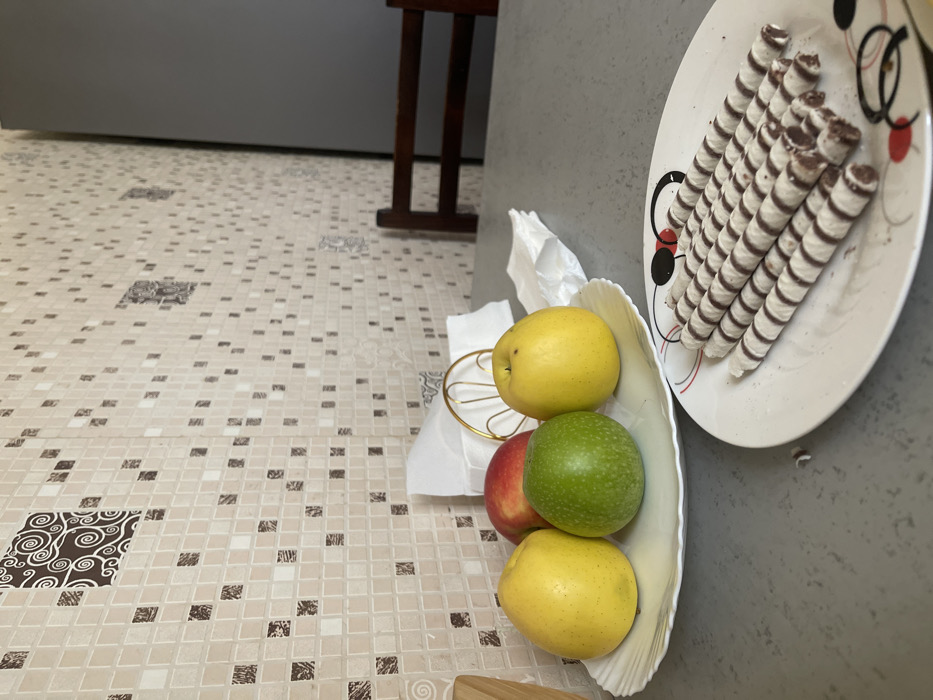 The image depicts an indoor scene, likely a kitchen or dining area, in Tbilisi, Georgia. No specific landmarks or unique identifiers are present to indicate a precise location within the city. In the foreground and midground, a grey tabletop holds two plates. On the left, a white, fluted oval serving dish contains four whole apples: two yellow, one green, and one red. To the right, a white round plate with a black and red pattern (resembling mouse ear silhouettes) holds approximately 14-15 striped wafer rolls, light-colored with dark chocolate spirals. Scattered crumbs are visible on this plate and the adjacent tabletop. Behind the apples, a golden wire napkin holder contains white paper napkins, and a crumpled white paper napkin rests on the table beside it. The background wall is covered with a mosaic of small square tiles, predominantly light beige/cream, interspersed with darker brown and white tiles. Several larger, square decorative tiles with a dark brown swirling pattern are integrated into the mosaic. To the far right, a dark brown wooden chair back is partially visible, behind which a tall, dark grey, vertical rectangular object, likely an appliance or cabinet, is partially seen. No people are present, and no active interactions are depicted. The scene is a still life under ambient indoor lighting.