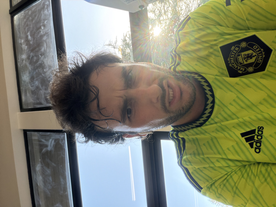 A man wearing a yellow Manchester United jersey takes a selfie. His dark hair is slightly messy, and he has stubble. The bright sun streams through a window behind him. The Adidas logo is visible on his sleeve, along with the Manchester United badge on his chest. The background includes a window with grimy panes. He is looking at the camera.