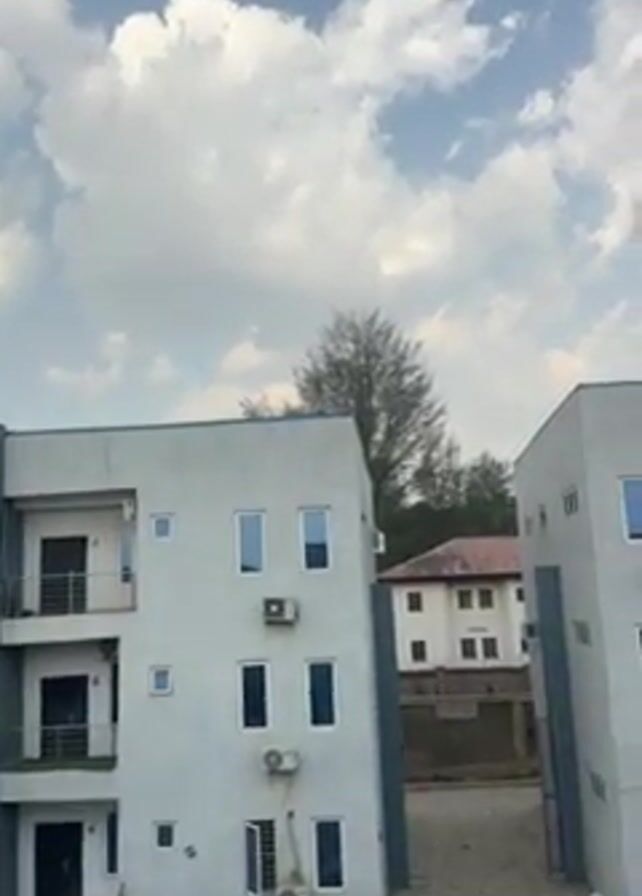 view of two modern, multi-story buildings with grey exteriors, dark-tinted windows, and multiple air conditioning units. They are situated next to each other. In the background, another white building with a red roof is visible. The sky is blue with scattered, fluffy white clouds. A tree can be seen partially between the two main buildings. The video is taken from a slightly elevated position, possibly a balcony or higher floor, looking out towards the buildings and sky.