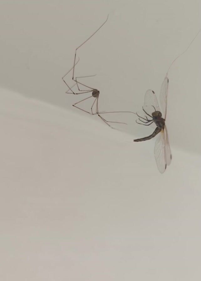 white ceiling with a spider and a dragonfly on it. The spider is a daddy long legs with thin, long legs. The dragonfly is hanging from a string or thread, and its wings are spread out. The spider is near the edge of the wall. The dragonfly is closer to the center of the ceiling. Both insects are stationary.