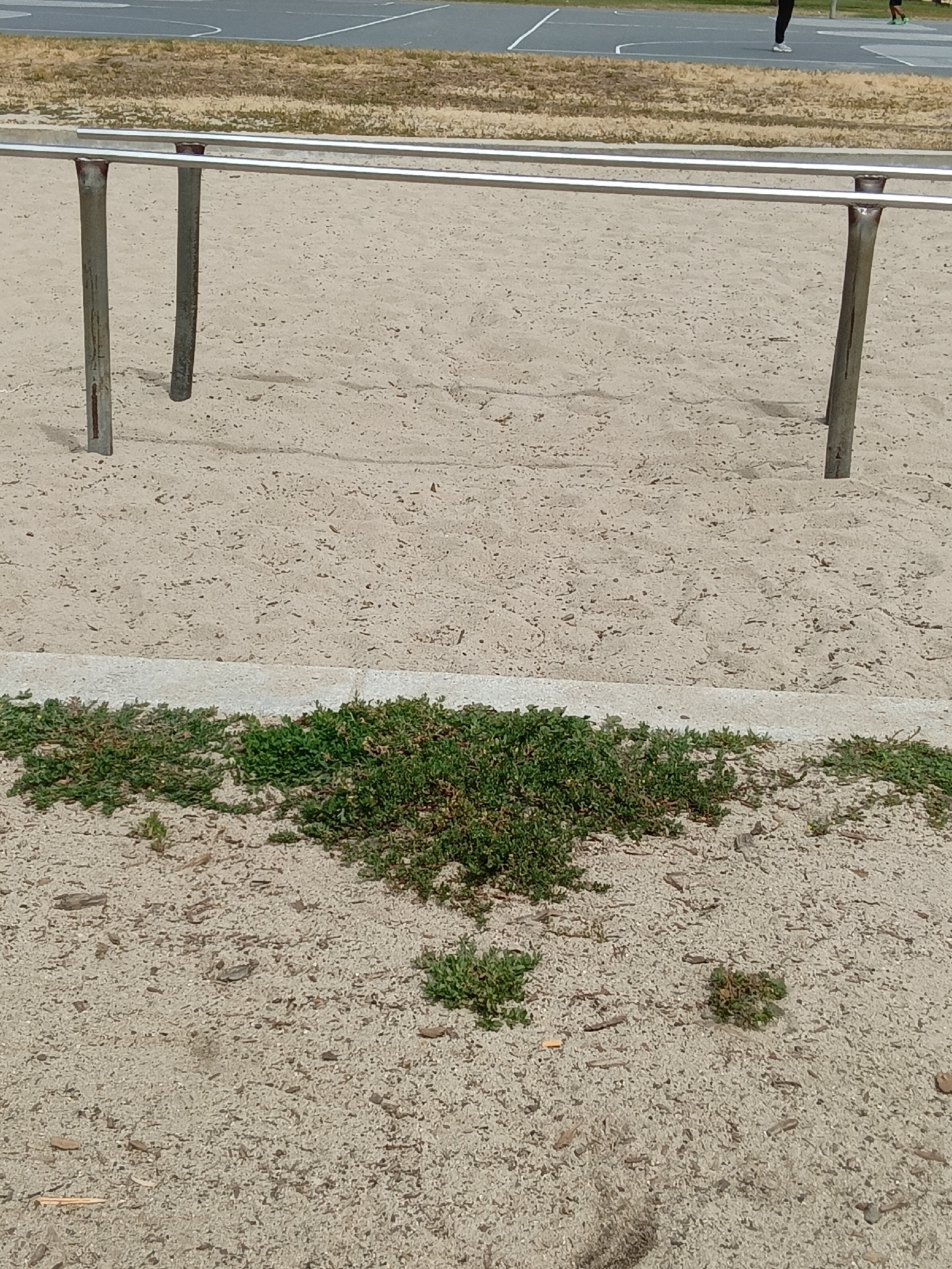 set of parallel bars in a sandy area, likely a playground or park in Los Angeles, United States. The bars are made of metal and have three supports. The ground around the bars is covered in sand and some patches of green vegetation. In the background, a basketball court can be seen with two people standing on it. The overall environment appears to be an outdoor recreational space.