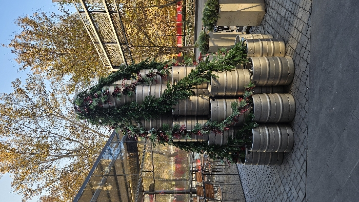 A Christmas tree constructed from beer kegs stands outdoors, decorated with garlands of greenery and red berries. The kegs are arranged in tiers, creating a conical shape. The scene includes trees with autumn foliage, a building with a glass facade, and outdoor seating. The ground is paved with dark gray stone bricks. The sky is clear and blue.