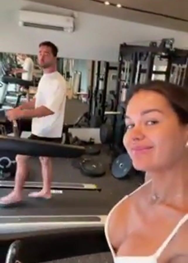 In a brightly lit gym, a woman in a white sports bra and skirt films herself while striking a playful pose, flexing her arm with a kissy face. Behind her, a man in a white t-shirt and dark shorts walks on a treadmill, barefoot, holding a drink in his hand. Various gym equipment, including weight machines and other treadmills, are visible in the background. A large mirror behind the treadmill reflects the gym's interior and the people exercising. An air conditioning unit is mounted high on the wall, suggesting a temperature-controlled environment.