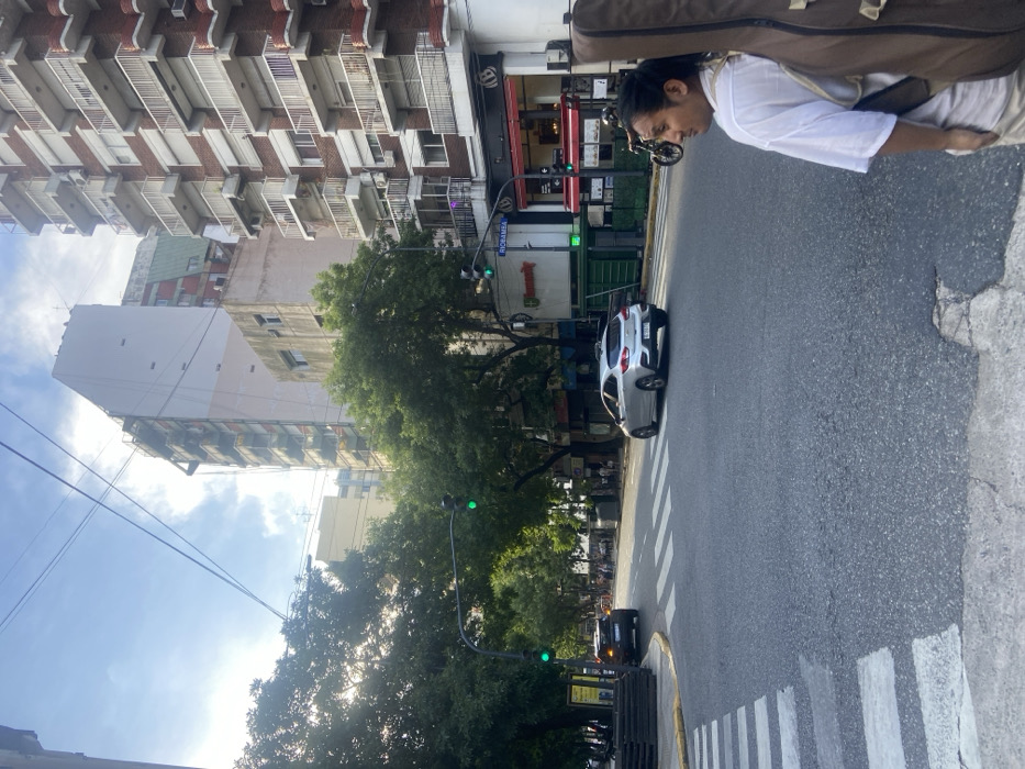 A man carries a guitar case. A silver car occupies a zebra crossing on a city street with tall buildings and trees. The traffic light is green, and another car is visible further down the street. A street sign reading "Rio Bamba" is attached to the traffic light.