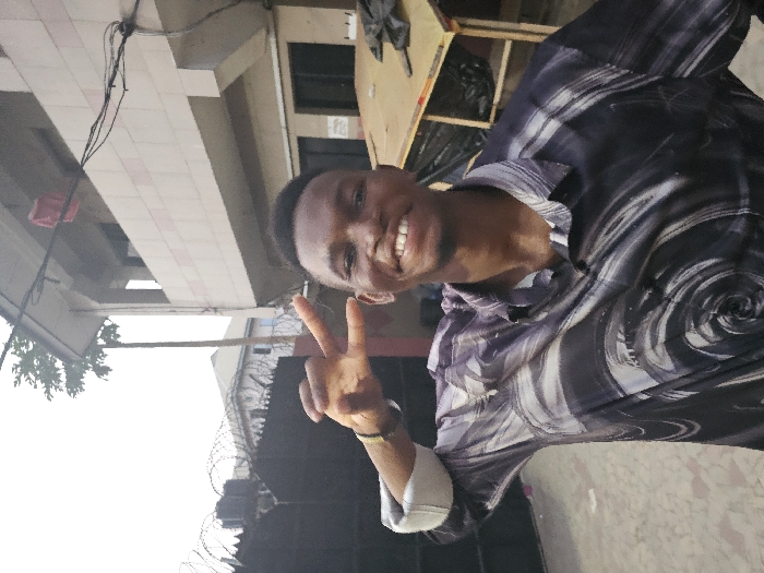 A smiling young man poses with a peace sign. He is wearing a patterned shirt with rolled-up sleeves. Behind him is a building, part of which is tiled, and an area enclosed with a black fence and barbed wire. There's a table or structure made of wood and black bags nearby. The shot is angled upwards. The lighting appears to be overcast or slightly dim.