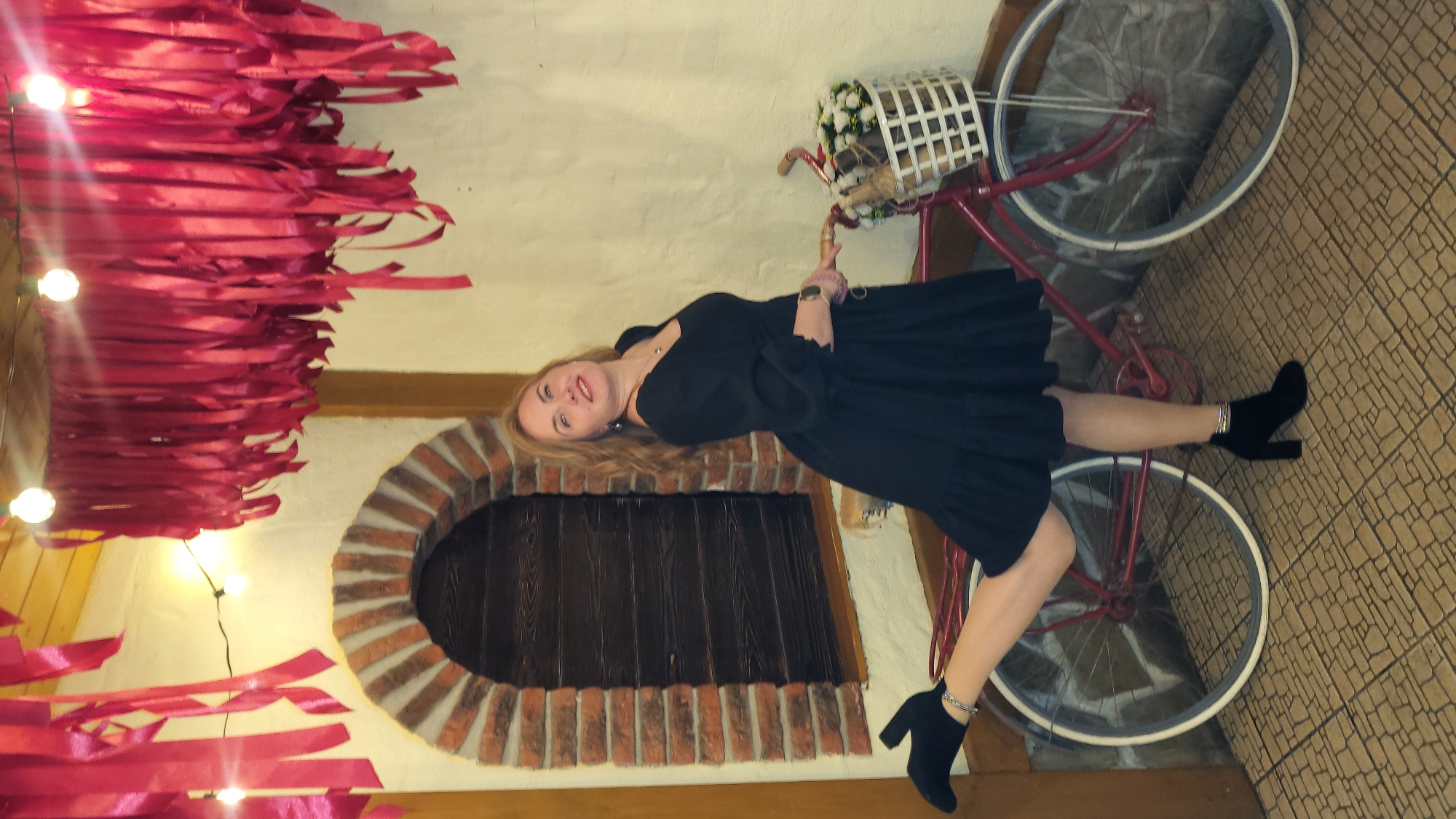 A woman poses with a red bicycle next to a bricked-up archway. She's wearing a black dress and black ankle boots. The bicycle has a white basket containing white flowers. The room is decorated with strands of red ribbon hanging from the ceiling and along the wall with string lights interspersed. The floor has a textured tile pattern. The image is rotated 90 degrees clockwise.