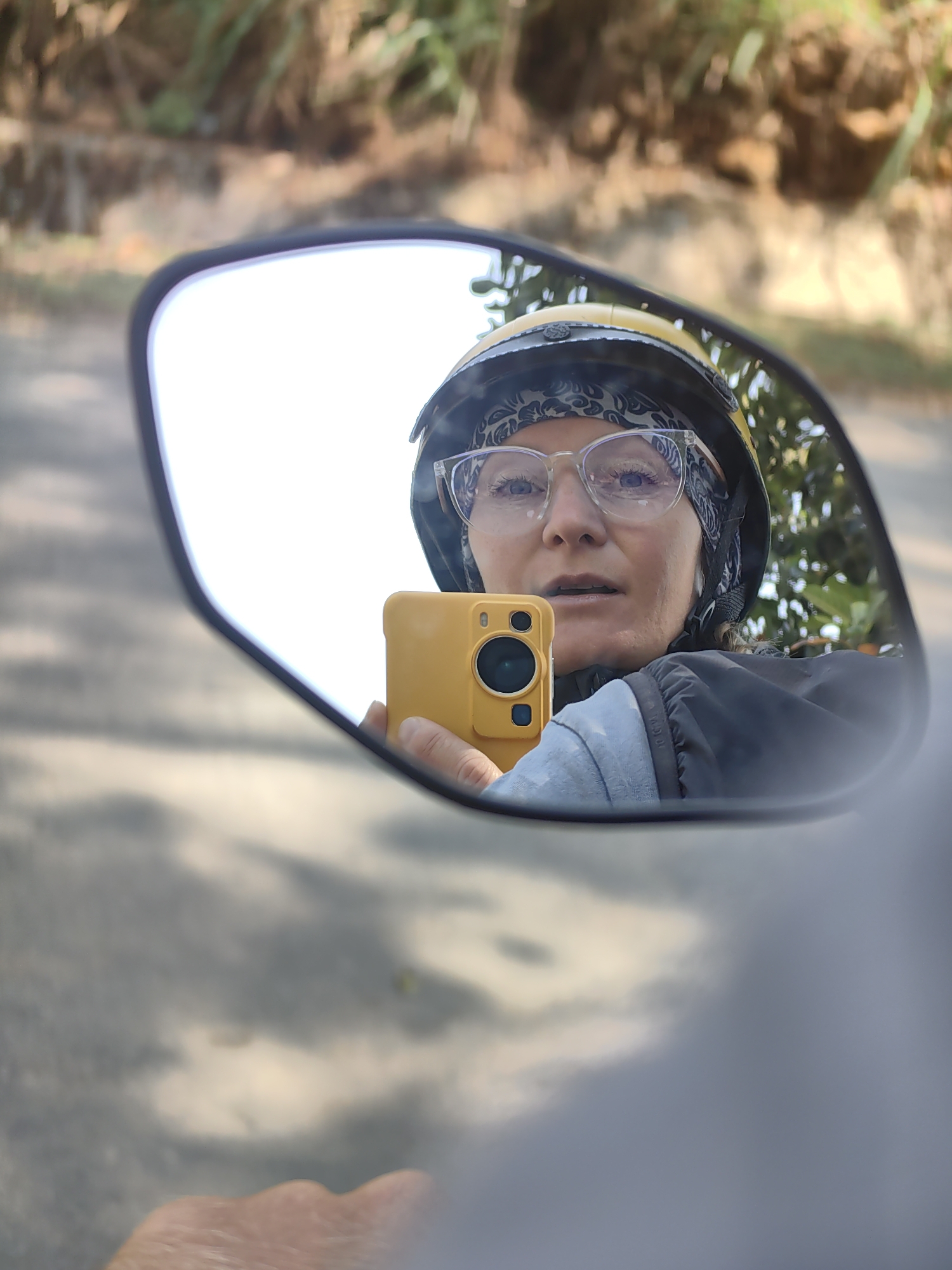 A woman with light skin and short hair, wearing glasses, a black-and-white patterned headscarf, and a yellow helmet, is reflected in a side mirror. She holds a yellow smartphone in her left hand, taking a selfie. Her attire includes a dark vest over a light blue shirt. The background reflection shows foliage. The mirror is attached to what appears to be a vehicle, possibly a motorbike. The photo was seemingly taken in Lùng Tám Commune, Vietnam, as indicated by the location. The road surface and surrounding environment are visible in the mirror and suggest a rural or semi-rural setting.