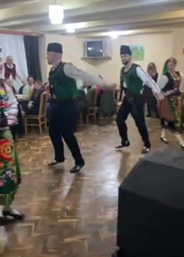 group of people performing a traditional folk dance indoors. They are wearing colorful costumes that include vests, skirts, and headpieces. Some of the men are wearing hats. The dance is taking place on a wooden floor in a room that appears to be a banquet hall or event space. There are tables and chairs set up around the perimeter of the room, and several people are seated at the tables watching the performance. A large black speaker sits on the floor in the foreground. The room is lit by overhead lighting, and a television is mounted on the wall in the background.