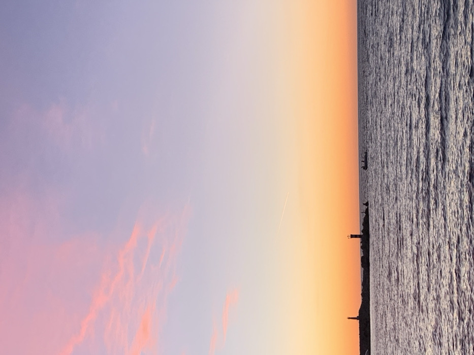 The image depicts a coastal scene in Bar, Montenegro, at dusk or dawn. The sky, occupying the upper two-thirds, displays a gradient from light lavender at the top, transitioning to pastel pink with wispy clouds, and then to a vibrant orange-gold near the horizon. A faint white contrail is visible horizontally in the orange section of the sky. The lower third of the image shows dark, rippled ocean water under low light conditions. A rocky breakwater or pier extends from the far left towards the center-left. On this breakwater, two dark, silhouetted structures resembling lighthouses or beacons are present; the one further left is taller and slender, while the one closer to the center is shorter with a broader base, topped with a red light source. Small, indistinct figures are discernible on the breakwater near the second lighthouse. In the mid-right portion of the water, a small boat carrying two silhouetted individuals is observed.