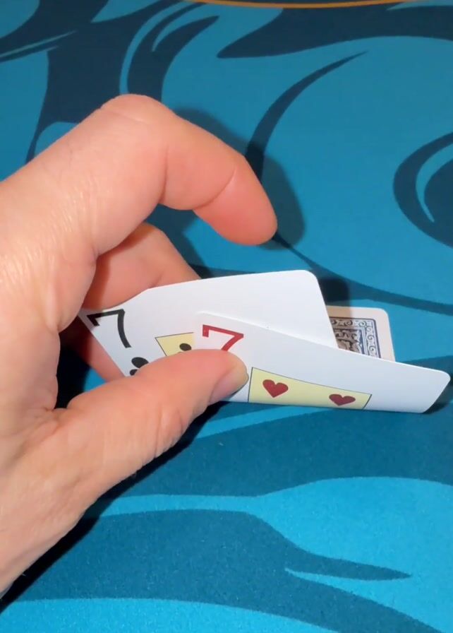 A hand gently holds a face-down playing card, slightly lifted to reveal the edge of another card underneath