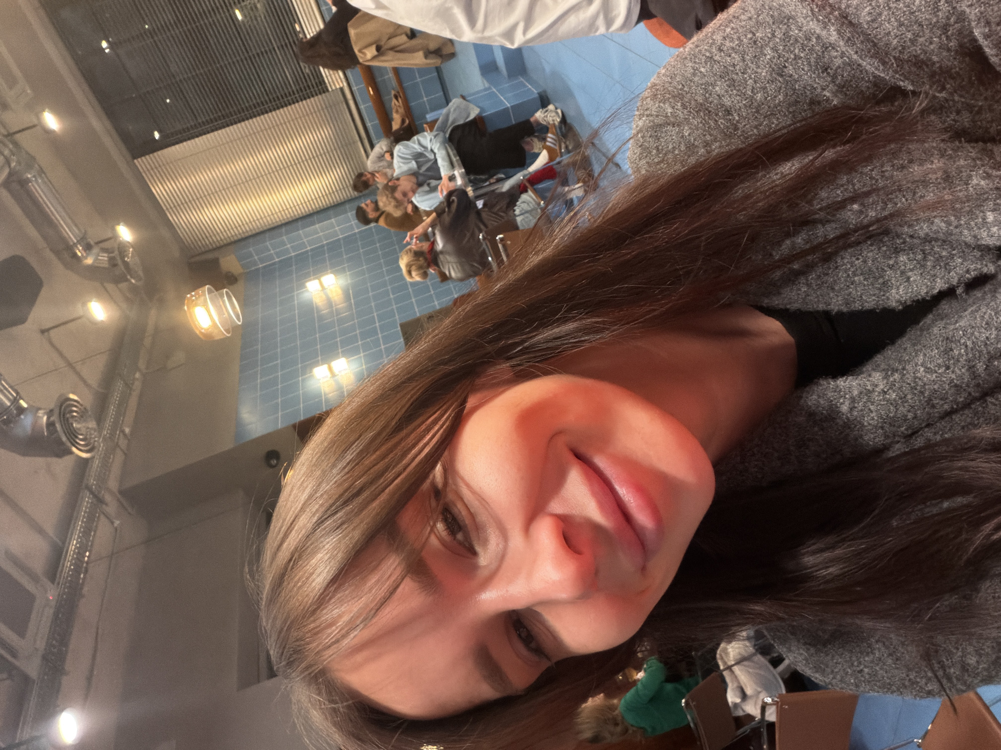 A close-up selfie shows a woman with brown hair wearing a grey sweater and a black top. She is smiling and looking into the camera. The background is a dimly lit indoor space. In the background, other people are sitting at tables. The lighting includes ceiling lights and what appears to be decorative fixtures. The location appears to be a cafe or restaurant in Moscow, Russia.