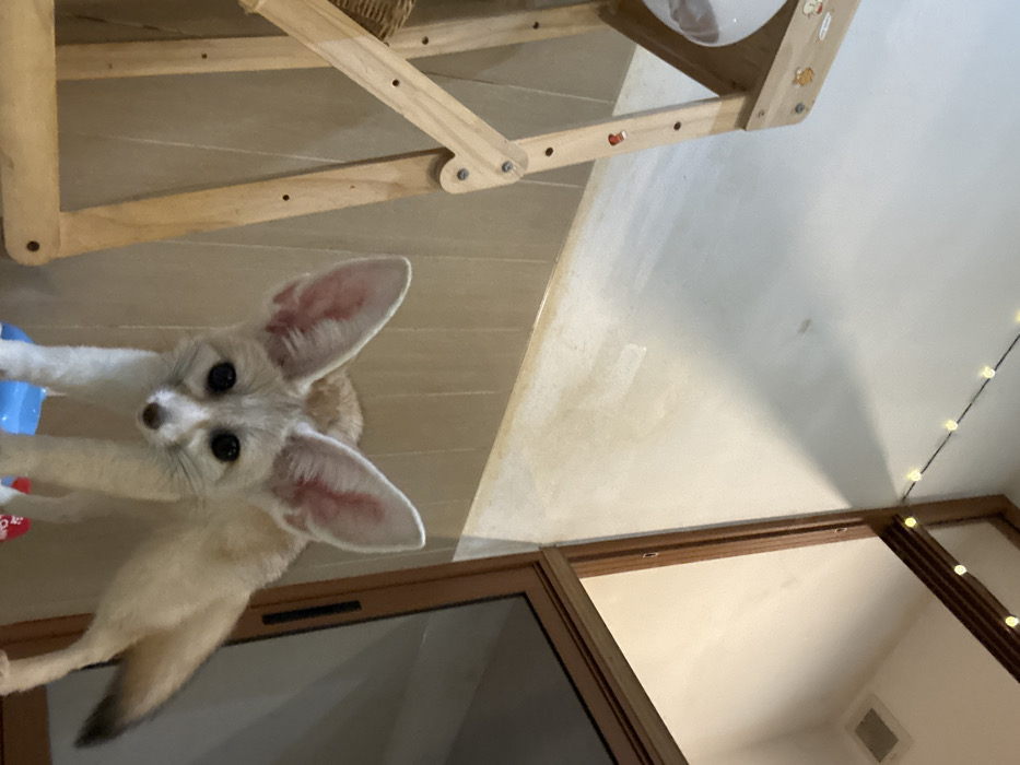An indoor scene depicts a Fennec fox standing in the foreground, looking directly at the viewer