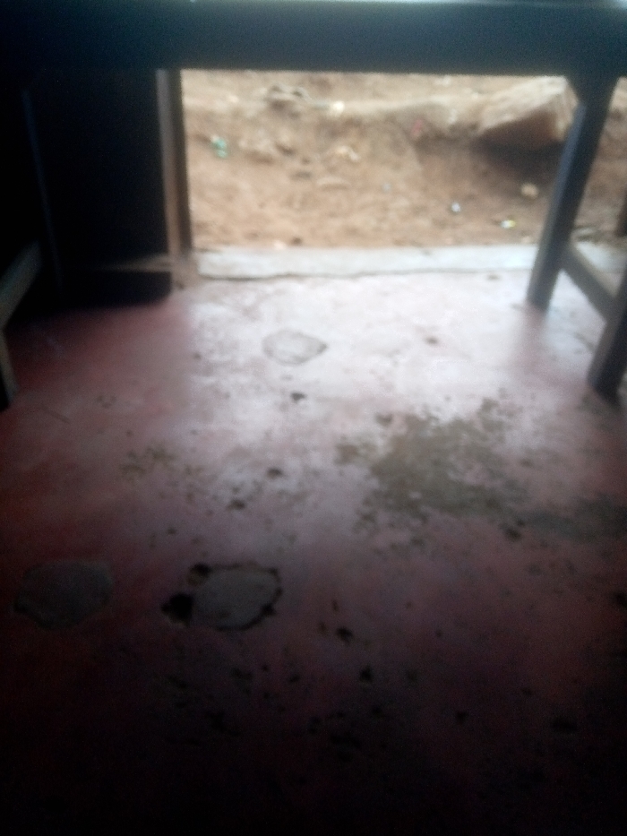 An interior view reveals a worn, reddish-brown floor marred by stains and patches of exposed material. A doorway leads to an outdoor area with a dirt surface and sparse vegetation. Parts of furniture frame the scene, adding to the sense of being indoors. The composition is dimly lit, casting shadows and obscuring details.