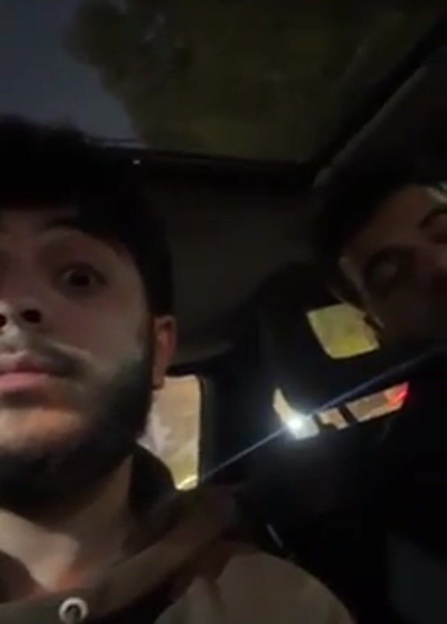 Two men are inside a car at night. The man on the left is looking at the camera with wide eyes and a slightly surprised expression. He has a beard and is wearing a hooded sweatshirt. The man on the right is in the passenger seat, with his eyes closed, seemingly asleep. A sunroof is visible above them, showing trees and the night sky. The car's interior is dark, but there is some light reflecting off the windshield and dashboard. The setting appears to be urban, with streetlights visible in the background.