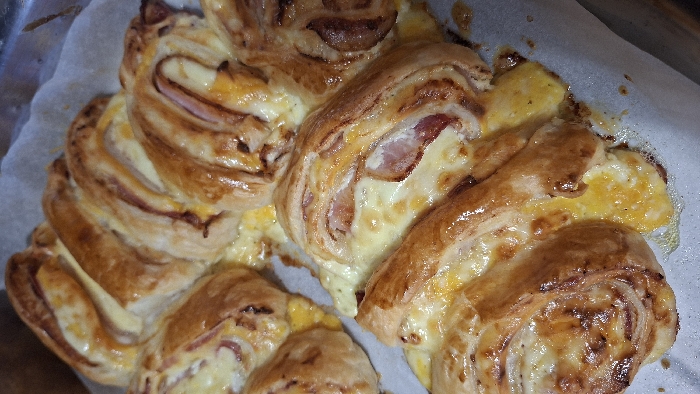 - "The image displays a close-up, high-angle view of multiple freshly baked, savory pastries arranged on white parchment paper within a metallic baking tray" by FM-BY3hf2, licensed under CC BY 4.0