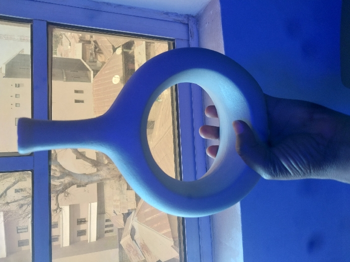 - "A light blue, matte-finish ceramic vase with a narrow neck and a large, hollow circular body is held by a person's right hand" by FM-jdFGd2, licensed under CC BY 4.0