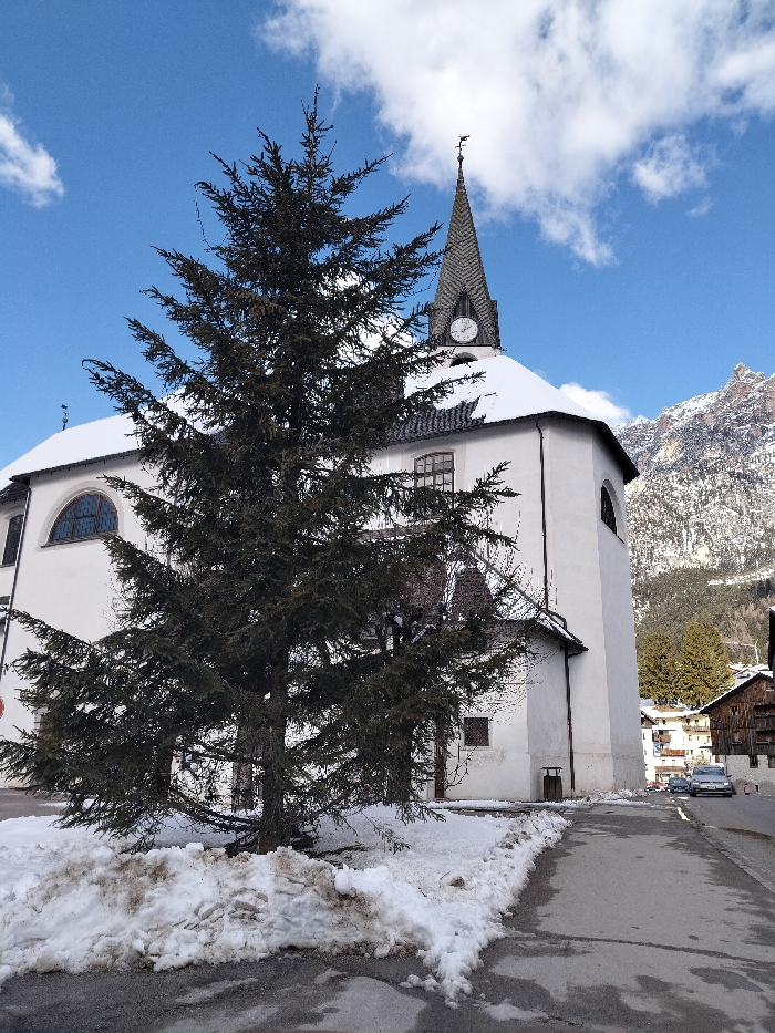 The image depicts a winter scene in Serdes, Italy, featuring a large evergreen tree in the foreground positioned slightly left of center. The tree, dark green with some brown tones, stands amidst irregular patches of dirty, partially melted snow covering the dark asphalt ground. Behind the tree, a white-walled church building with a prominent steeple is visible. The church roof is dark and partially covered with snow. The steeple, featuring a dark conical roof, houses a circular clock face indicating approximately 11:20 or 11:30. A dark weather vane with an animal-like figure crowns the steeple's peak. Visible architectural details on the church include arched windows on the main edifice and rectangular windows on the tower section. To the right of the church and in the distant background, snow-capped mountains rise under a bright blue sky dotted with scattered white clouds. A paved road or pathway runs along the right side of the image, showing remnants of snow. A few distant buildings with traditional architecture and some sparse evergreen trees are observable between the church and the mountains. No individuals are present in the scene.