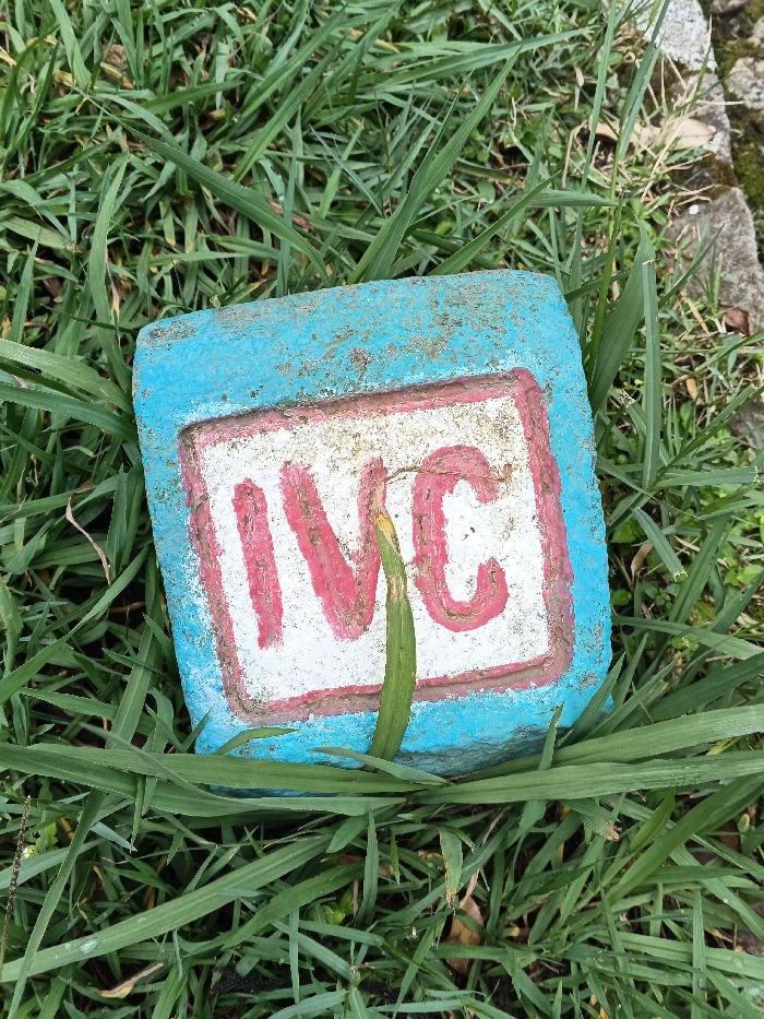 A weathered, rectangular block, appearing to be concrete or stone, is centrally positioned amidst green grass. The block features a cyan-blue border framing a central white panel, both showing signs of dirt and wear. The capital letters "IVC" are painted in red on the white panel, with noticeable fading and chipping. A single, upright blade of green grass partially obscures the letter 'V'. The surrounding grass is unmanicured and covers the ground. In the upper right quadrant of the image, a light grey concrete or stone edge is visible, bordering the grassy area. No individuals or specific identifying landmarks are present within the scene. While indicated as Kadoma, Zimbabwe, the image itself contains no visual markers to confirm this specific city or a precise location within it.