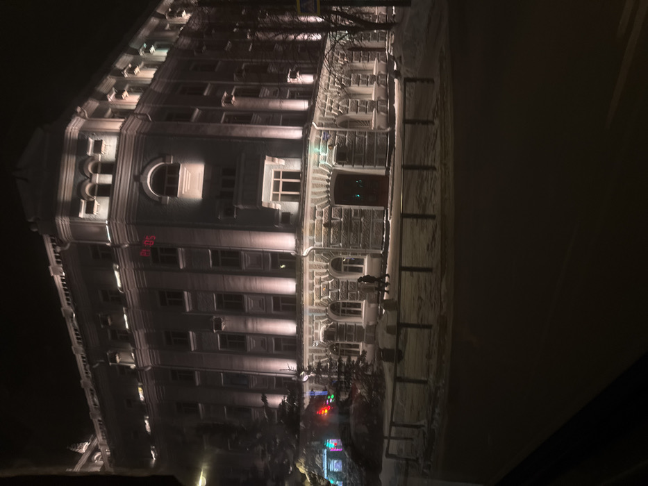 A multi-story, illuminated building at night. The building exhibits classical architectural details, with multiple rows of windows and decorative elements. The side of the building features a clock showing the time "21:05". Below, there are some blurred reflections in the street, possibly from street lights or other buildings. The foreground is mostly dark.