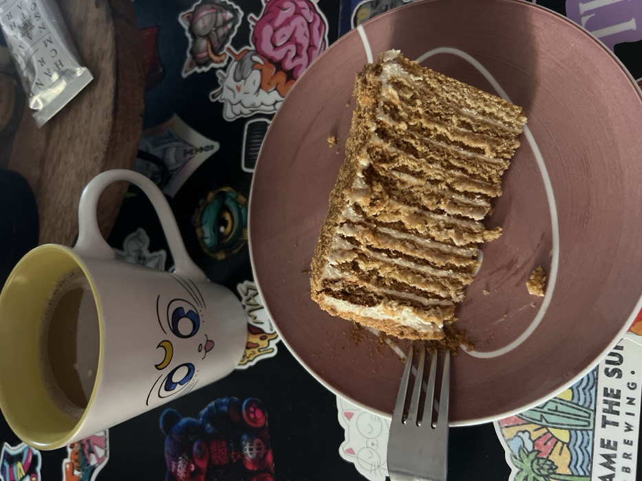 - "A slice of layered honey cake sits on a pink plate, with a fork partially inserted" by FM-Dbw9B3, licensed under CC BY 4.0