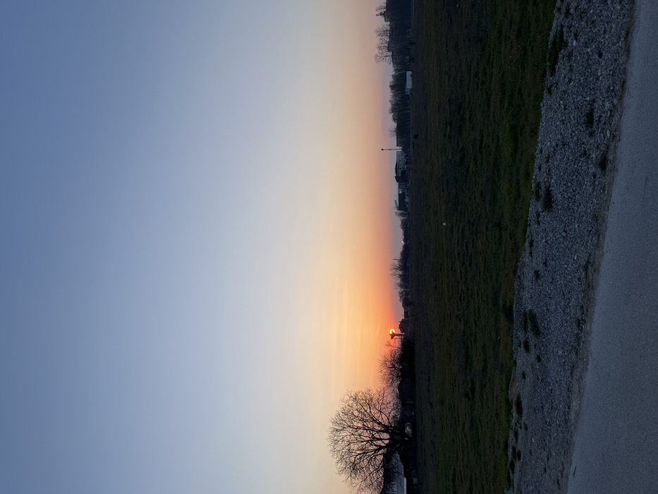 The image depicts an exterior scene at dusk in Rakovski, Bulgaria. The sky transitions from a clear, light blue overhead to a deep orange and red at the western horizon, where the sun is partially visible as a bright orange disk. The immediate foreground features a segment of dark asphalt roadway on the left, bordered by a strip of coarse grey gravel. The midground consists of an extensive, open field covered in dark green and brown vegetation. In the left mid-background, a large, leafless deciduous tree stands prominently. To its right, a tall, slender water tower with a bulbous top is silhouetted against the setting sun. The distant background horizon line reveals a sparse line of dormant trees and a cluster of low-rise buildings and structures, including a slender, red-topped mast or tower on the far right. No individuals or dynamic actions are present.