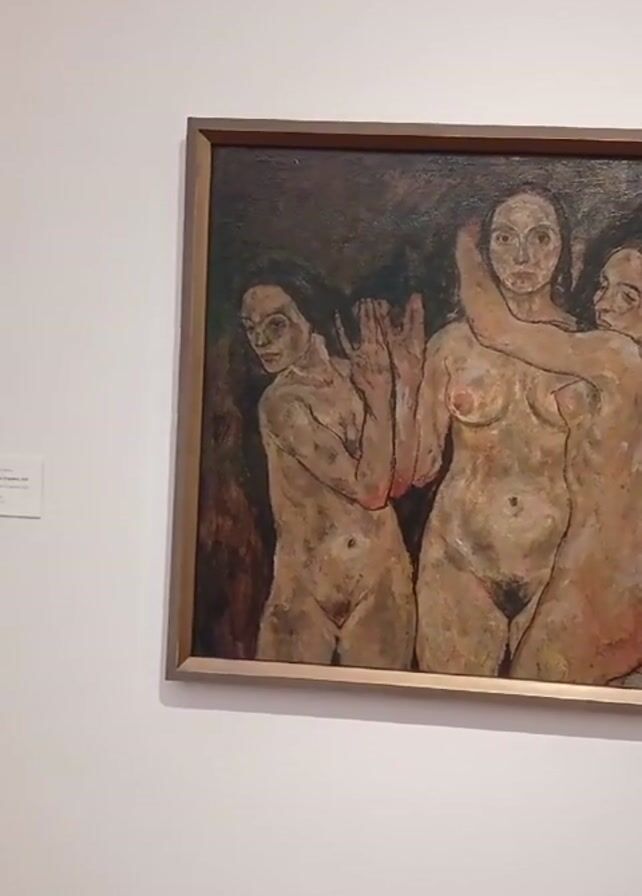 framed painting on a white wall in a museum or gallery setting. The painting depicts three nude female figures standing closely together against a dark, indistinct background. The figures are rendered in earthy tones, with visible brushstrokes. The central figure is embraced by the figure on the right. The figure on the left has one hand raised.