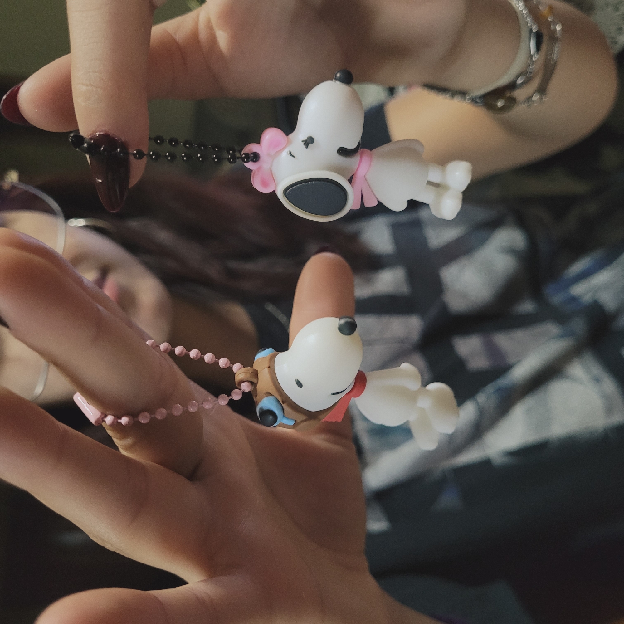 The image displays a close-up of a person's hands holding two cartoon dog keychains against a blurred indoor background in San Fernando del Valle de Catamarca, Argentina. The left hand, showing a digit with a pink-polished fingernail, holds a white Snoopy-character keychain depicted in an aviator's outfit with a brown cap, blue goggles, and a red scarf. This keychain is suspended by a pink plastic ball chain. The right hand, revealing a digit with a dark maroon-polished fingernail, holds a white Snoopy-character keychain adorned with a pink bow on its head and a pink ribbon around its neck. This second keychain is suspended by a black plastic ball chain. The individual's upper torso and face are visible in the soft-focus background, showing dark hair, clear-framed glasses, and a dark, subtly patterned garment. A multi-strand silver-toned bracelet is present on the right wrist.