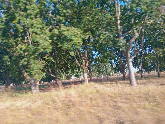 A sunlit landscape displays scattered trees with green foliage. The trunks are light gray. Dry, brown grass covers the foreground, suggesting a field or open area. The sky is visible between the branches. The blur in the image may be due to the motion. A faint fence is visible behind the trees.