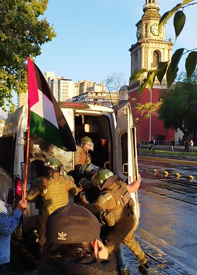 scene in what appears to be an urban environment, with a church tower visible in the background. The video is oriented vertically, and the street is wet. Several police officers wearing riot gear are forcibly pushing an individual into the back of a white van. A Palestinian flag is attached to the back of the van. A person with pink hair is also seen filming the scene on a cell phone. In the background, other figures can be seen near the street. A siren sound can be heard in the background.
