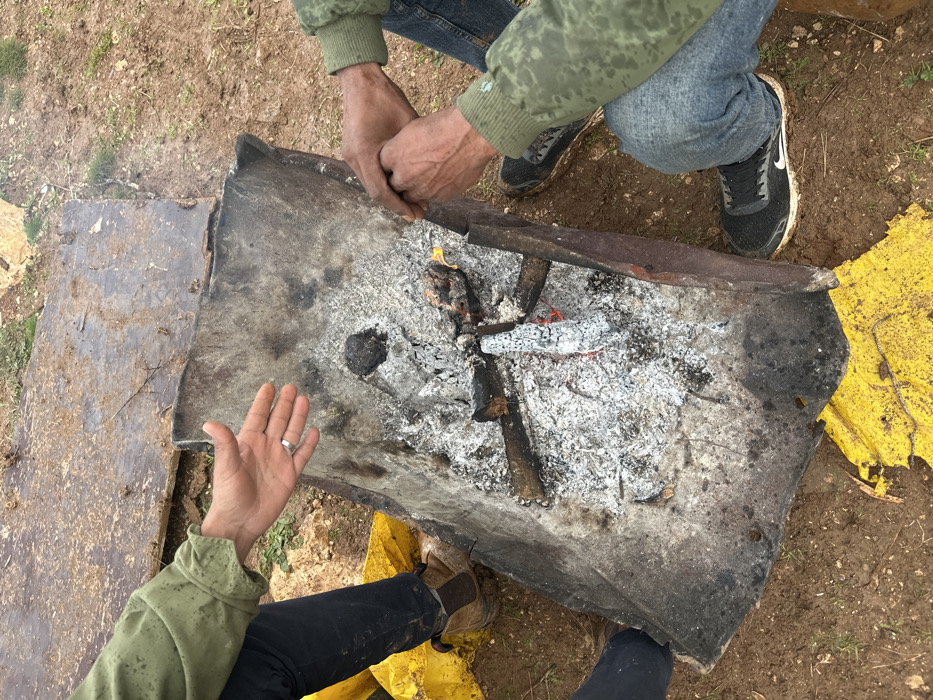 Two individuals are positioned around an improvised metal fire pit in an outdoor setting within the city of Unknown, Palestinian Territory
