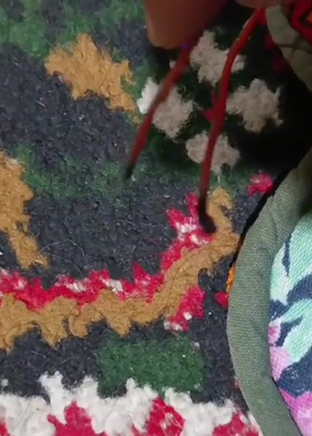 A person holds two exposed red wires that touch, causing a spark. The sparks start out purple and then turn orange. The wires are held over a rug with a brown, red, and green pattern, next to a pair of slippers with a floral pattern. A white USB charging block sits on the rug to the left.