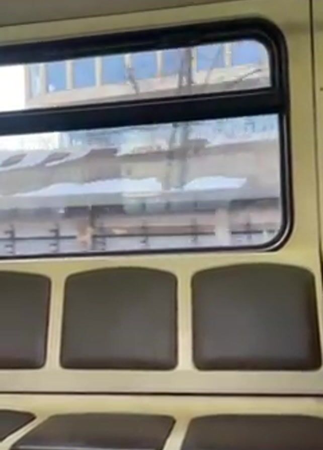 The camera captures a view from inside a moving train