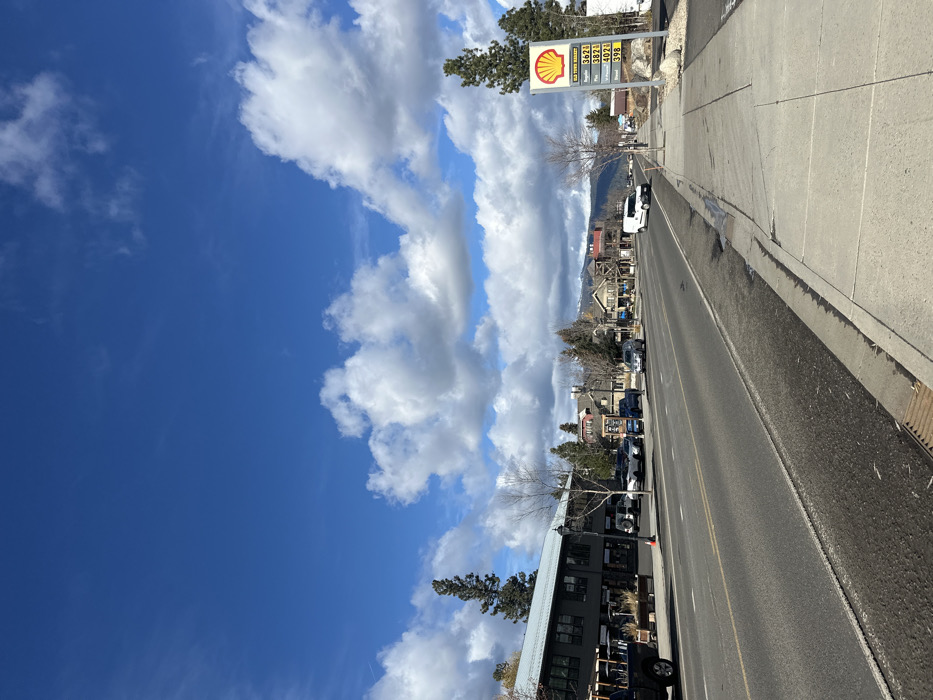 A daytime street view with a blue sky and scattered clouds. A Shell gas station sign displays prices. A row of parked cars lines the left side of the road, with buildings and trees visible behind them. A sidewalk borders the road on the right. The road appears to lead towards distant mountains.