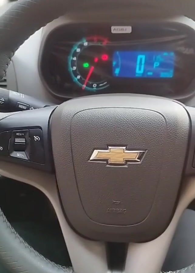 close-up view of the interior of a car, specifically the dashboard and steering wheel area. The steering wheel has a gray cover with a diamond-stitched pattern and a Chevrolet logo in the center. The dashboard features a digital display showing information such as the car's speed (currently at 0), gear (in park), and mileage. The car's radio is visible with a blue display, and the climate controls are located below it. The overall color scheme of the interior is a mix of gray and black. There is no one visible in the video, and the focus is solely on the car's interior features.