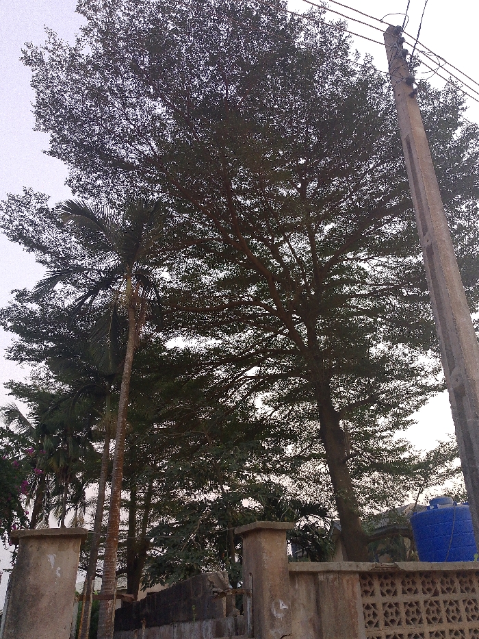 Towering trees with dense foliage dominate the scene, obscuring much of the sky. A slender palm stands to the left, contrasting with the broader trees. Below, a weathered wall partially encloses the area, punctuated by pillar-like structures. A blue water tank is visible behind the wall. An electricity pole rises on the right, with wires extending across the frame.