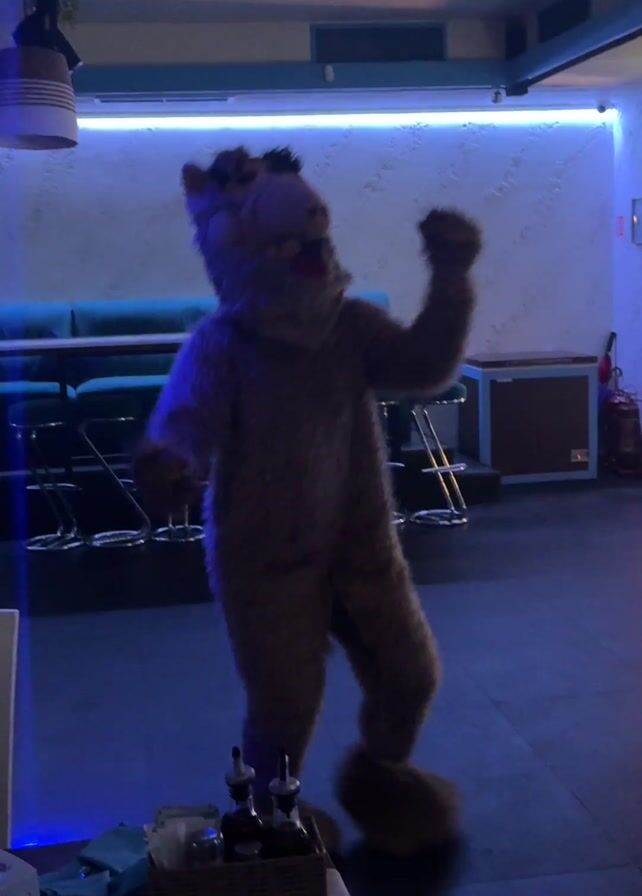 person dressed in an ALF costume dancing in what appears to be a restaurant or bar