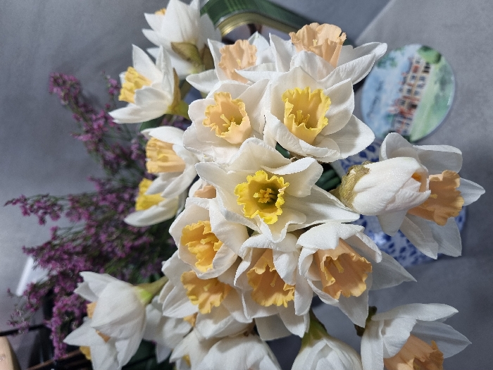 A bouquet of approximately two dozen daffodils is displayed in a blue and white patterned ceramic vase. The daffodils feature white outer petals and prominent coronas, predominantly yellow, with some exhibiting a peach-orange hue. Behind the daffodils, a blurred arrangement of purple dried flowers is visible. The vase rests on a textured grey surface. To the lower right, a circular coaster is partially obscured by the flowers, depicting an illustration of a large historic building with a green lawn in front. Visible text on the coaster identifies the building as "Kew Palace," located within the London Borough of Richmond upon Thames, London, United Kingdom. No individuals are present in the scene.
