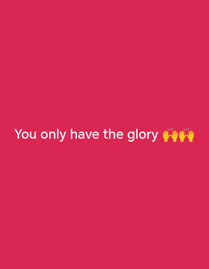 The image displays a solid magenta background (#E2214C). Centered horizontally and positioned in the lower half of the frame is white text that reads, "You only have the glory". Immediately following the word "glory", four yellow raised hands emojis are present, each featuring three radiating lines above the hands, symbolizing applause or praise. No people, discernible objects, actions, interactions, or a physical environment are depicted in this digital graphic. The image does not contain any visual information pertaining to a specific location in the city of Ijoko, Nigeria, or any other physical geographic coordinates.