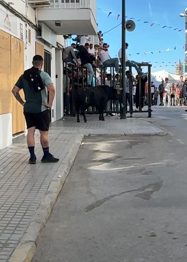 The scene captures a street festival event where a bull is goaded by individuals using a torch. Spectators, many positioned on top of a metal barricade, observe the scene. A man in a grey shirt and black shorts stands on the sidewalk, watching with his hands on his hips. Decorations can be seen strung across the street. The foreground is dominated by the grey pavement, while white buildings line the background.