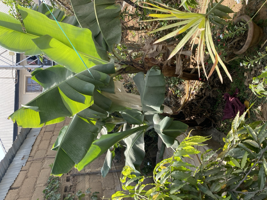 This image depicts an outdoor garden or backyard scene in Jos, Nigeria, under bright daylight. The foreground and mid-ground are dominated by several mature banana plants featuring large, vibrant green leaves, some of which are backlit and appear translucent due to direct sunlight. One banana plant in the center-left has a light-colored protective material, possibly a plastic wrap or fabric, covering a portion of its stem or fruit cluster. To the left, a dense cluster of other leafy green plants with smaller, elongated leaves is visible. In the lower right, a plant with long, spiky, yellowish-green leaves grows in a brown terracotta pot, surrounded by smaller green plants and some scattered red and white flowers. The ground consists of visible soil mixed with dried leaves and sparse green vegetation. A crumpled piece of dark red fabric lies on the ground near the base of the central banana plant. A light-colored hose or pipe is partially visible on the ground in the mid-left. A thin green string or wire extends horizontally across the upper mid-section of the image, traversing through the banana foliage. In the background, a concrete block wall runs horizontally across the left side, topped by a corrugated metal roof. To the right of the wall, a portion of a cream-colored building with a multi-paned window is visible, suggesting a residential structure. Above the building, a metal pole structure, possibly an antenna or utility pole, is partially discernible. No people are present in the scene.