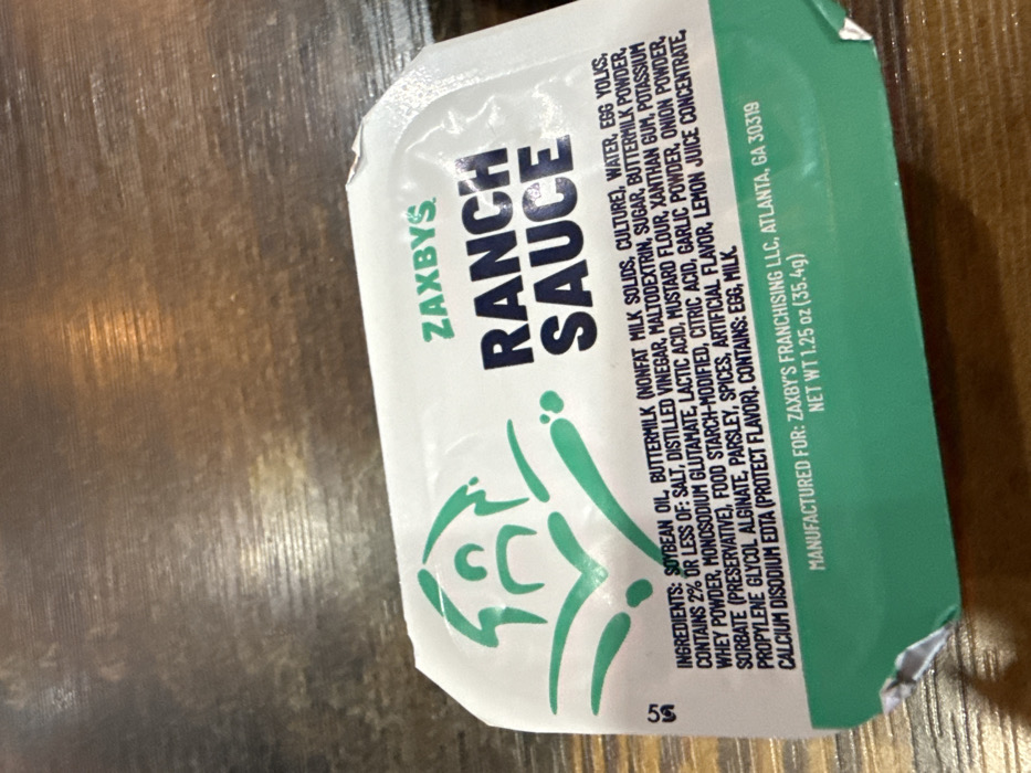 A Zaxby's Ranch Sauce packet sits on a wooden surface